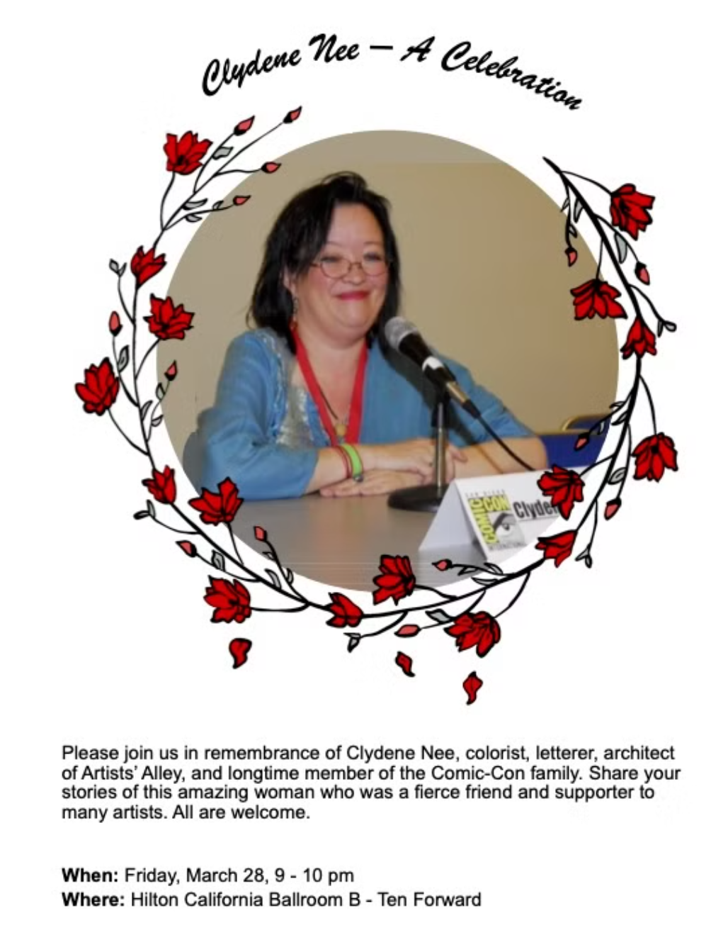 There will be a celebration of life for Clydene during WonderCon on Friday, March 28, from 9-10 pm at the Hilton California Ballroom B – Ten Forward